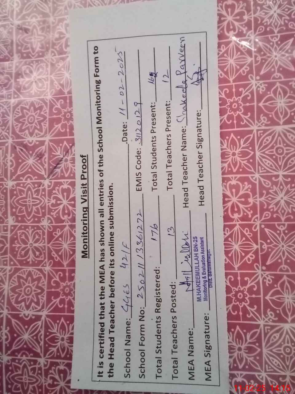 | Attendance Register | Head Teacher | MEA with School | Visit Proof |