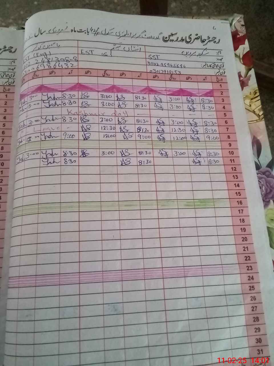 | CNIC | Full Name | Designation | R/C | Absence During Last Calender Month |