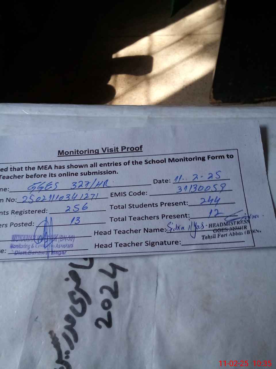 | Certified that this School was Inspected by the Undersigned MEA/DMO Today and the Information Stated Above is as Per Record. | |||||