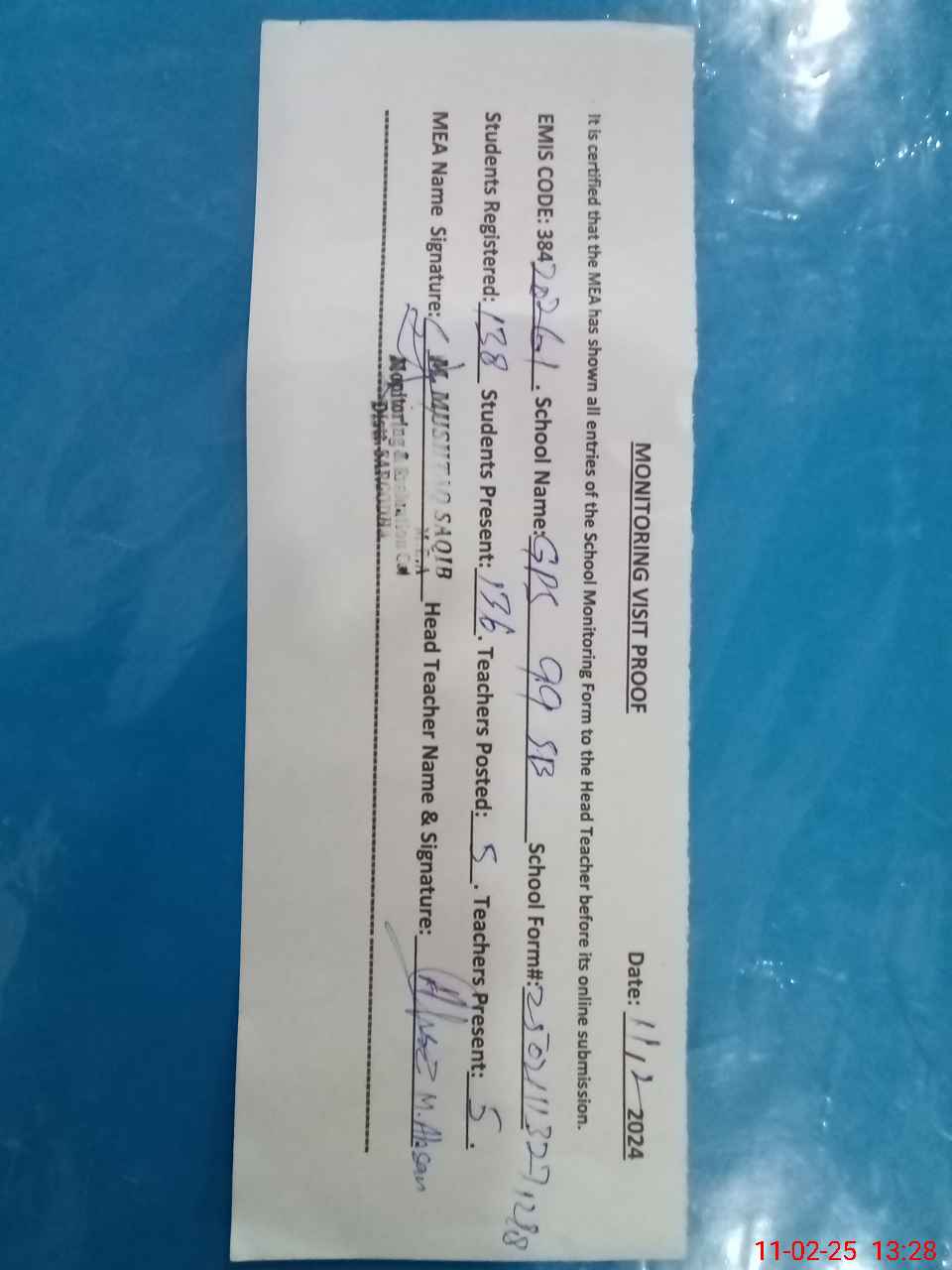 | Attendance Register | Head Teacher | MEA with School | Visit Proof |