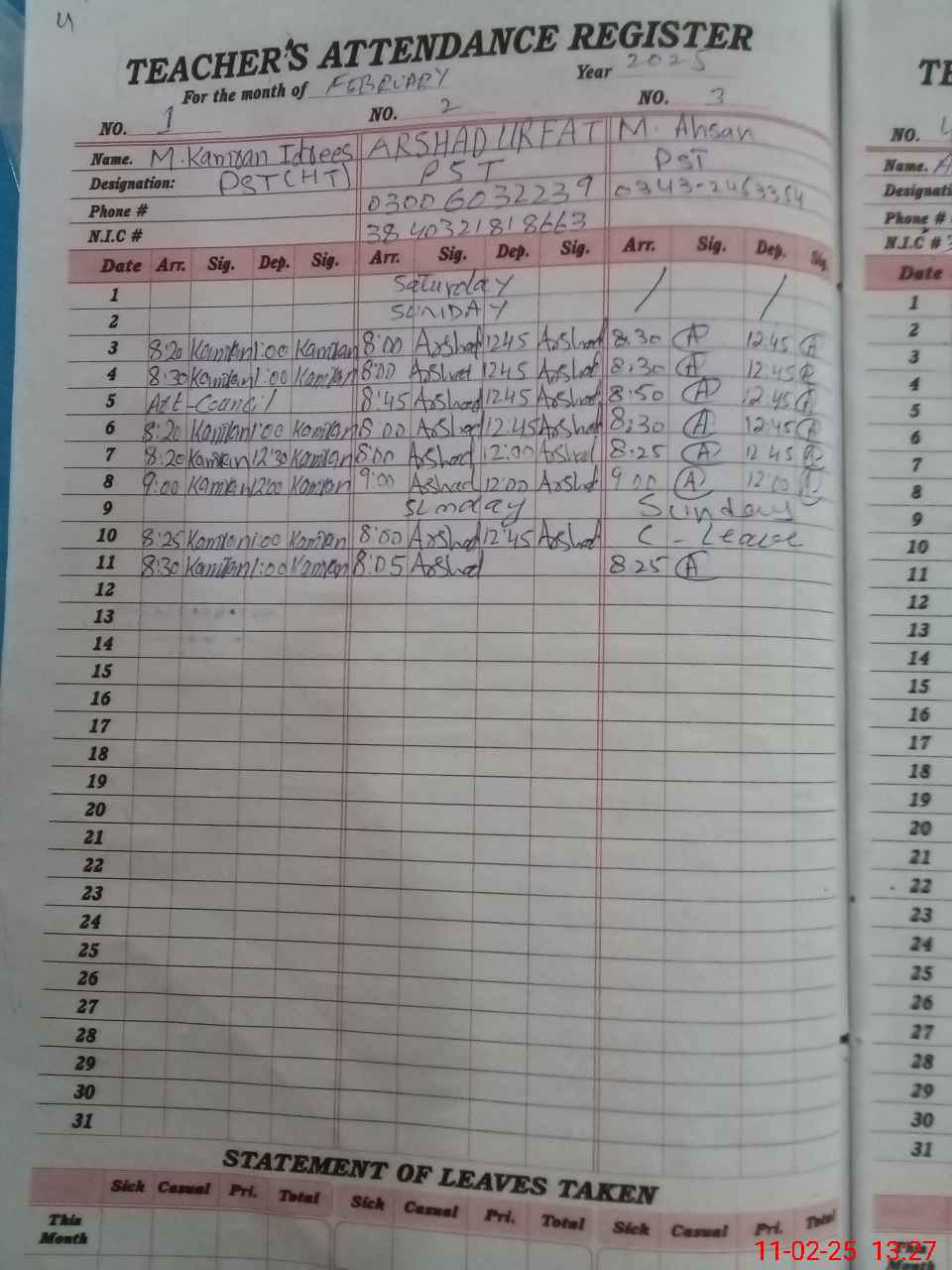 | CNIC | Full Name | Designation | R/C | Absence During Last Calender Month |