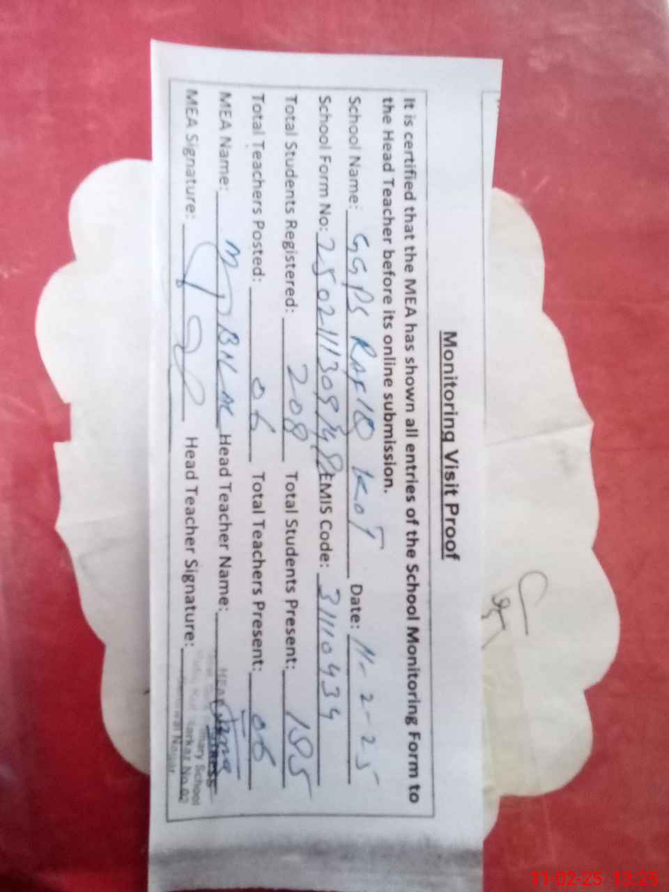 | Attendance Register | Head Teacher | MEA with School | Visit Proof |