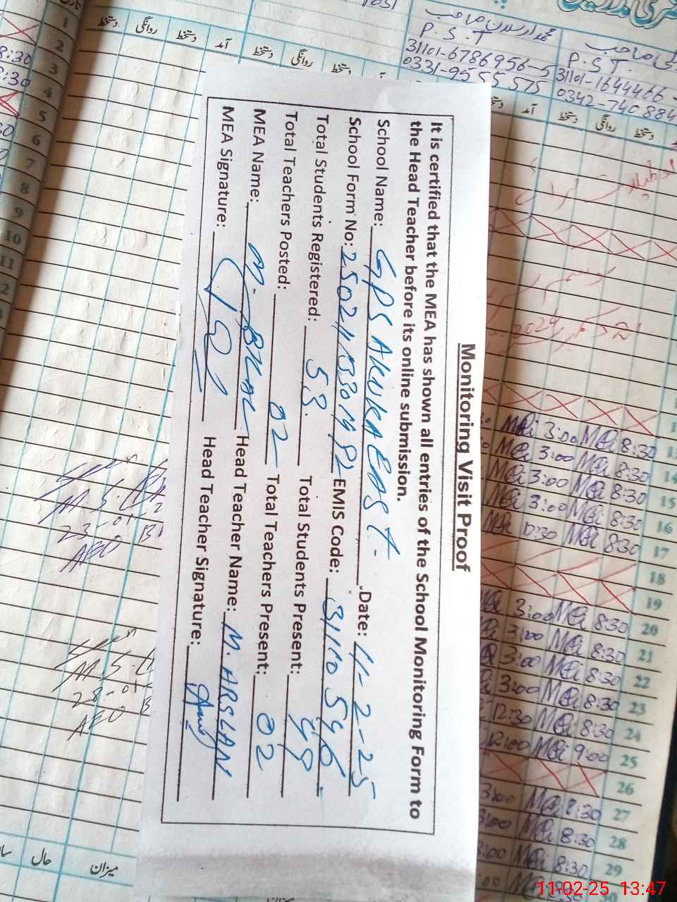 | Attendance Register | Head Teacher | MEA with School | Visit Proof |
