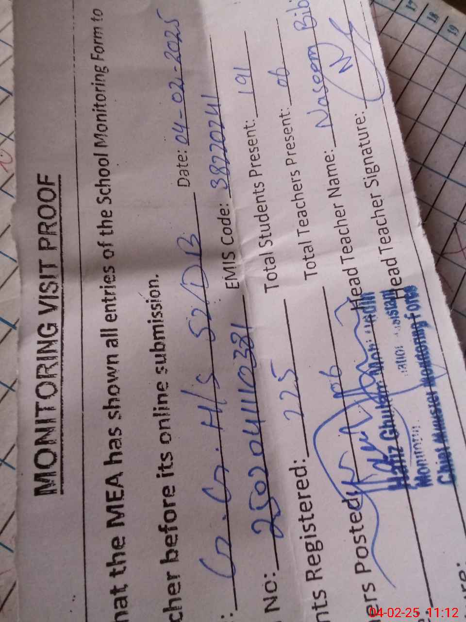 | Attendance Register | Head Teacher | MEA with School | Visit Proof |