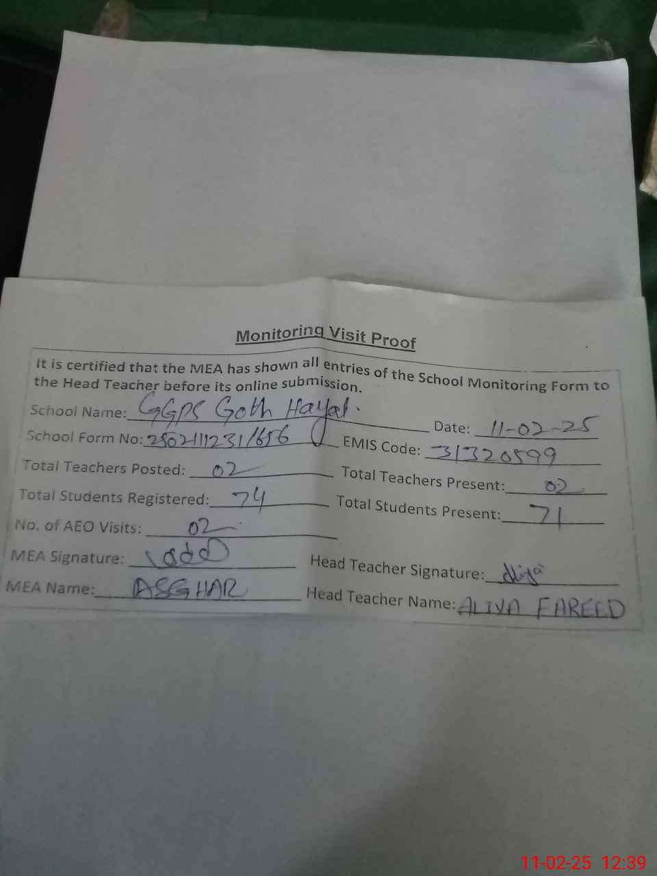 | EMIS Code: 31320599 | Name of School: GGPS GOTH HAYAT | |||