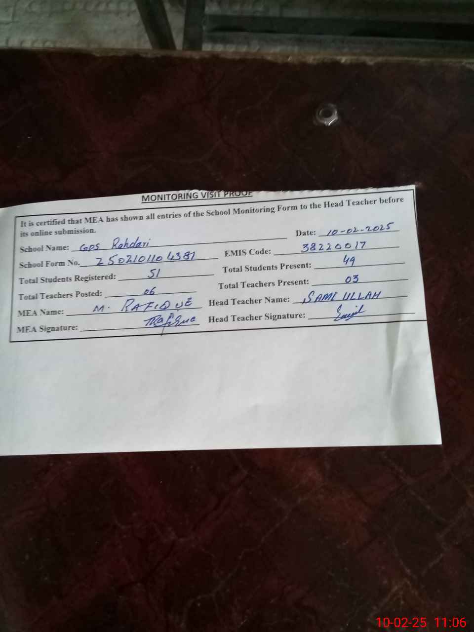 | EMIS Code: 38220017 | Name of School: GPS RAHDARI | |||