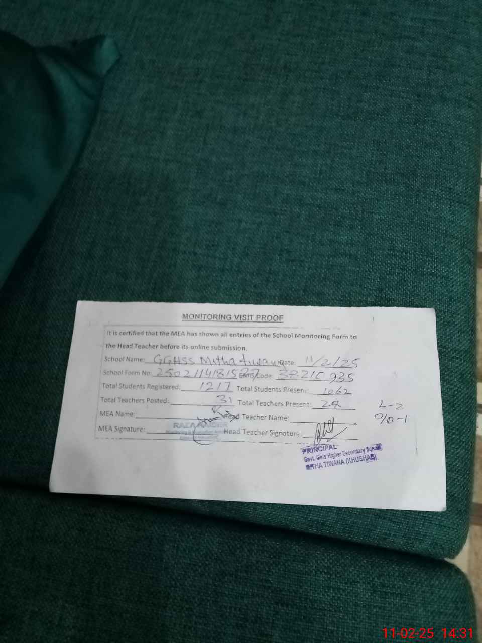 | Attendance Register | Head Teacher | MEA with School | Visit Proof |