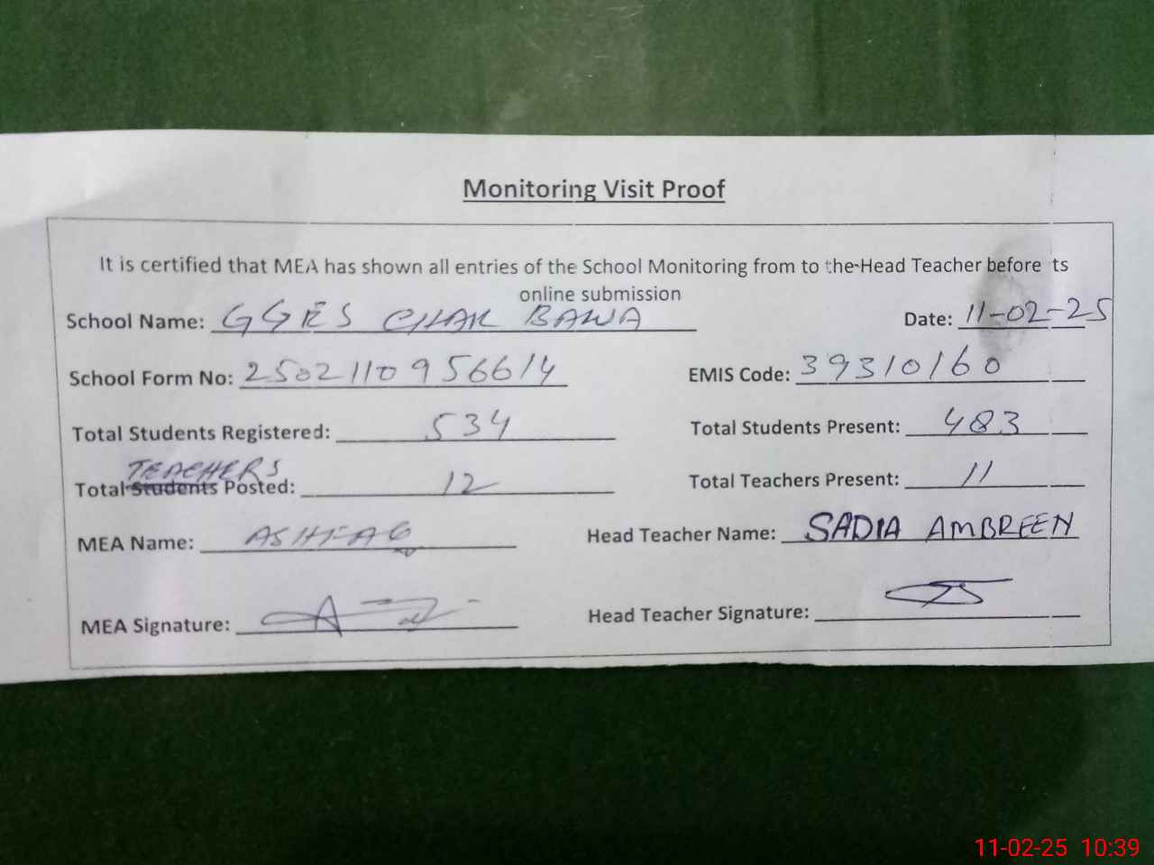 | EMIS Code: 39310160 | Name of School: GGES CHAK BAWA | |||