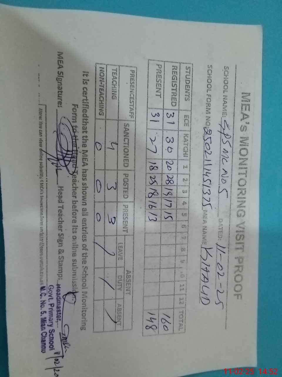 | Attendance Register | Head Teacher | MEA with School | Visit Proof |