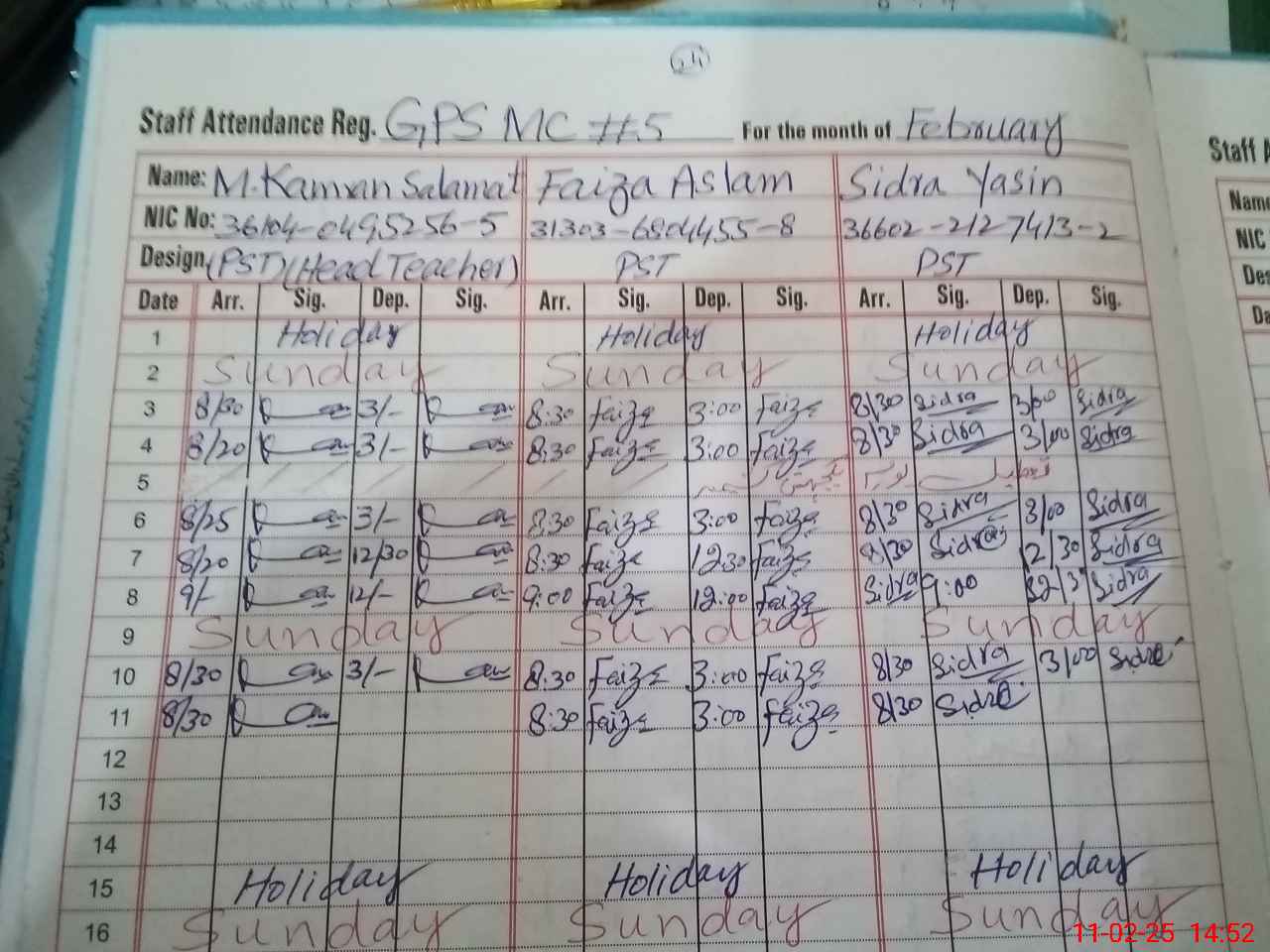 | CNIC | Full Name | Designation | R/C | Absence During Last Calender Month |