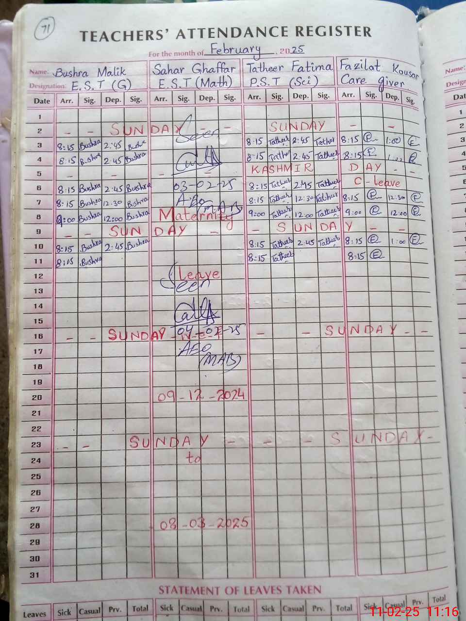 | Leave | Duty | Absent | Maternity | Medical | Ex- Pak |