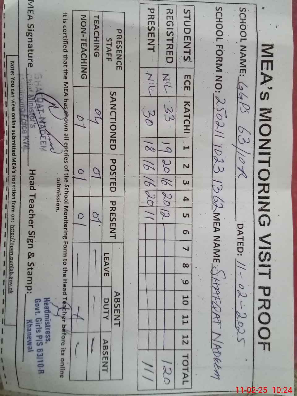 | EMIS Code: 36420391 | Name of School: GGPS 63/10-R, KHANEWAL | |||