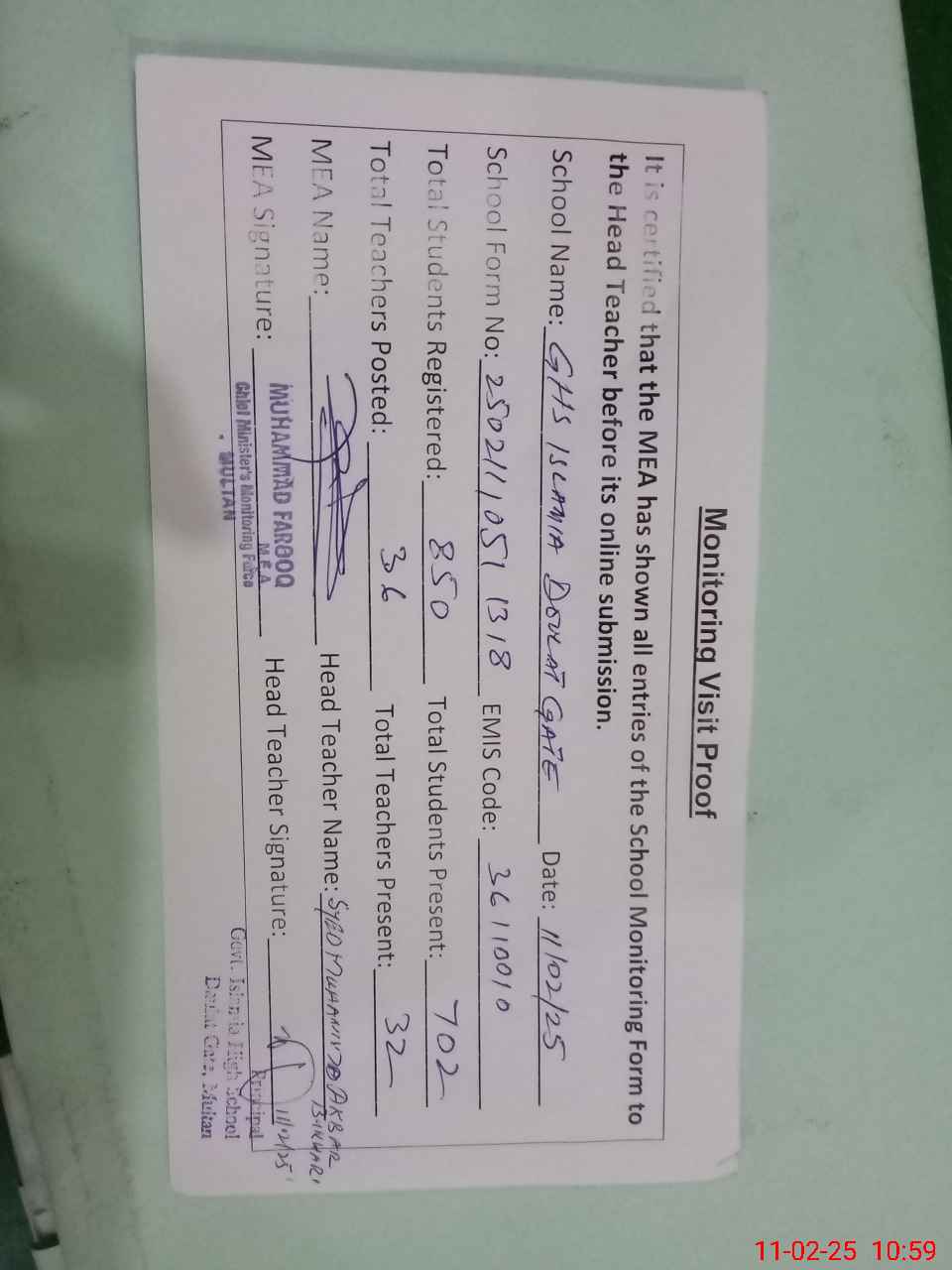 | EMIS Code: 36110010 | Name of School: GHS ISLAMIA DAULAT GATE MULTAN | |||