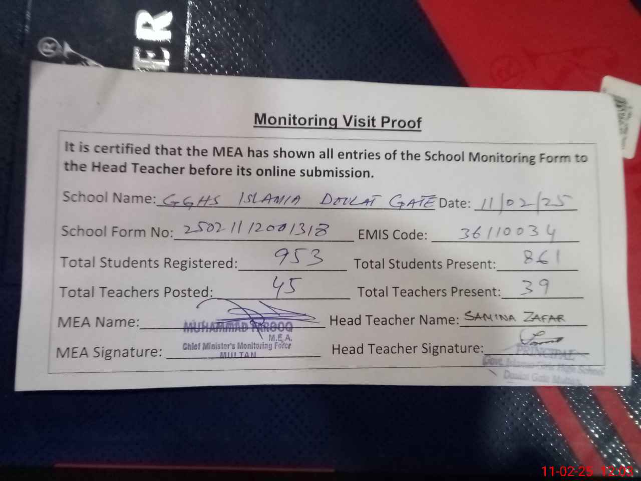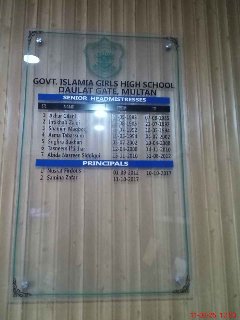 | EMIS Code: 36110034 | Name of School: GGHS ISLAMIA DOULAT GATE MULTAN | |||
