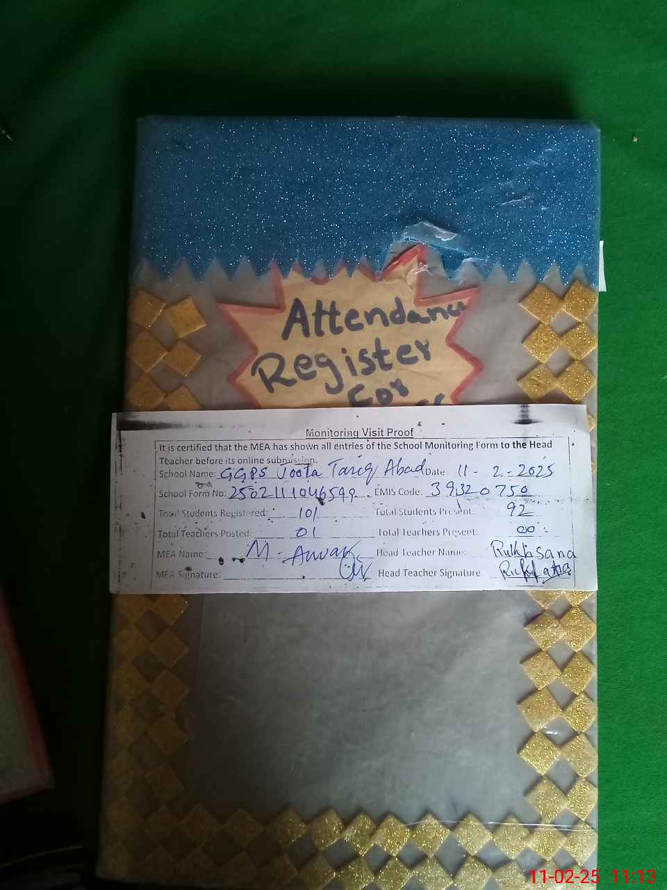 | Attendance Register | Head Teacher | MEA with School | Visit Proof |