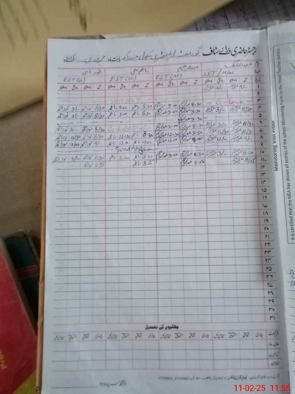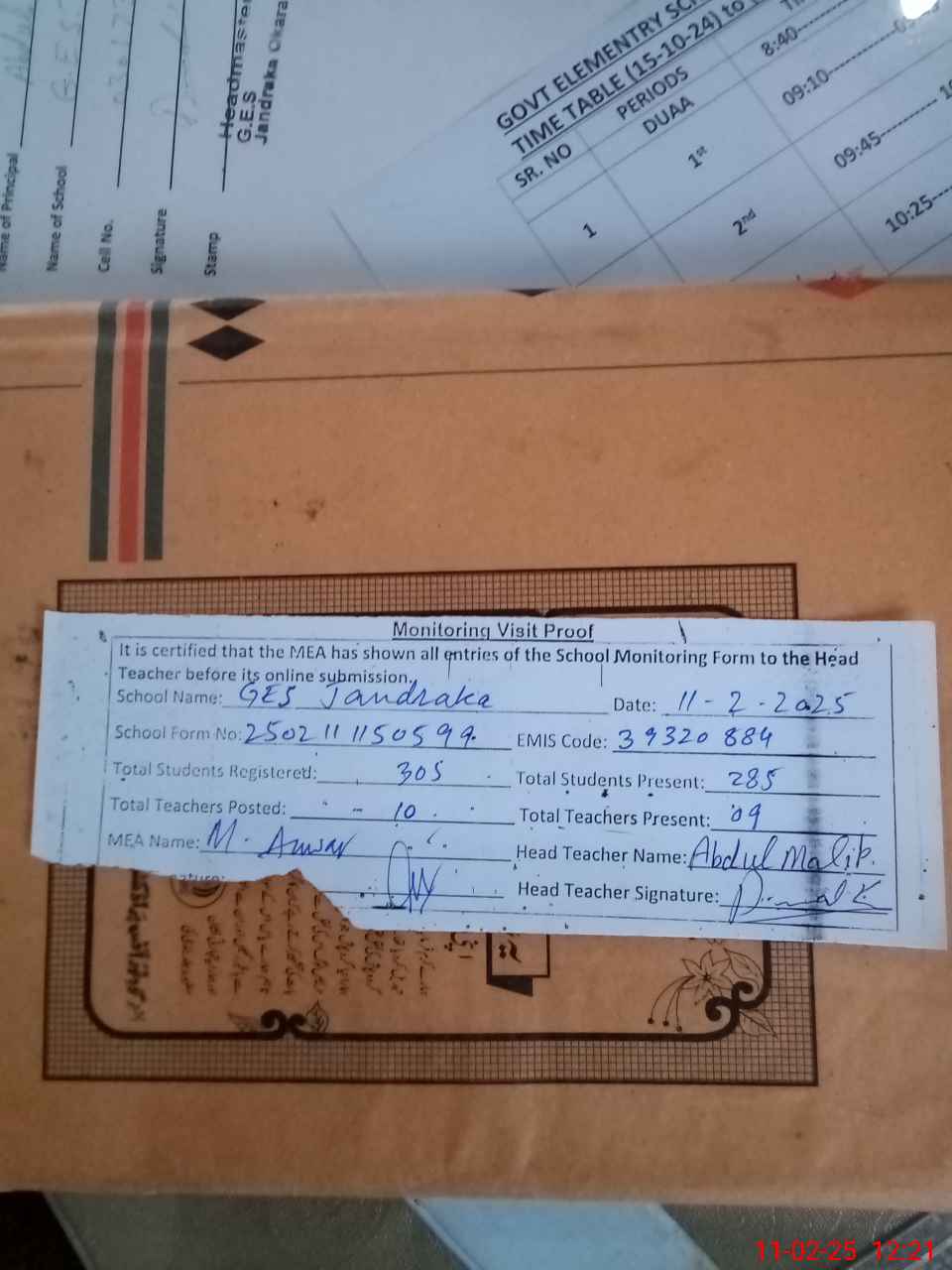 | Attendance Register | Head Teacher | MEA with School | Visit Proof |