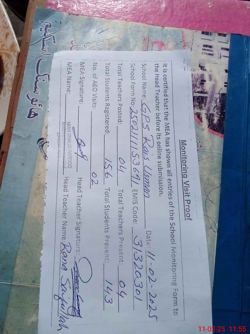 | Attendance Register | Head Teacher | MEA with School | Visit Proof |