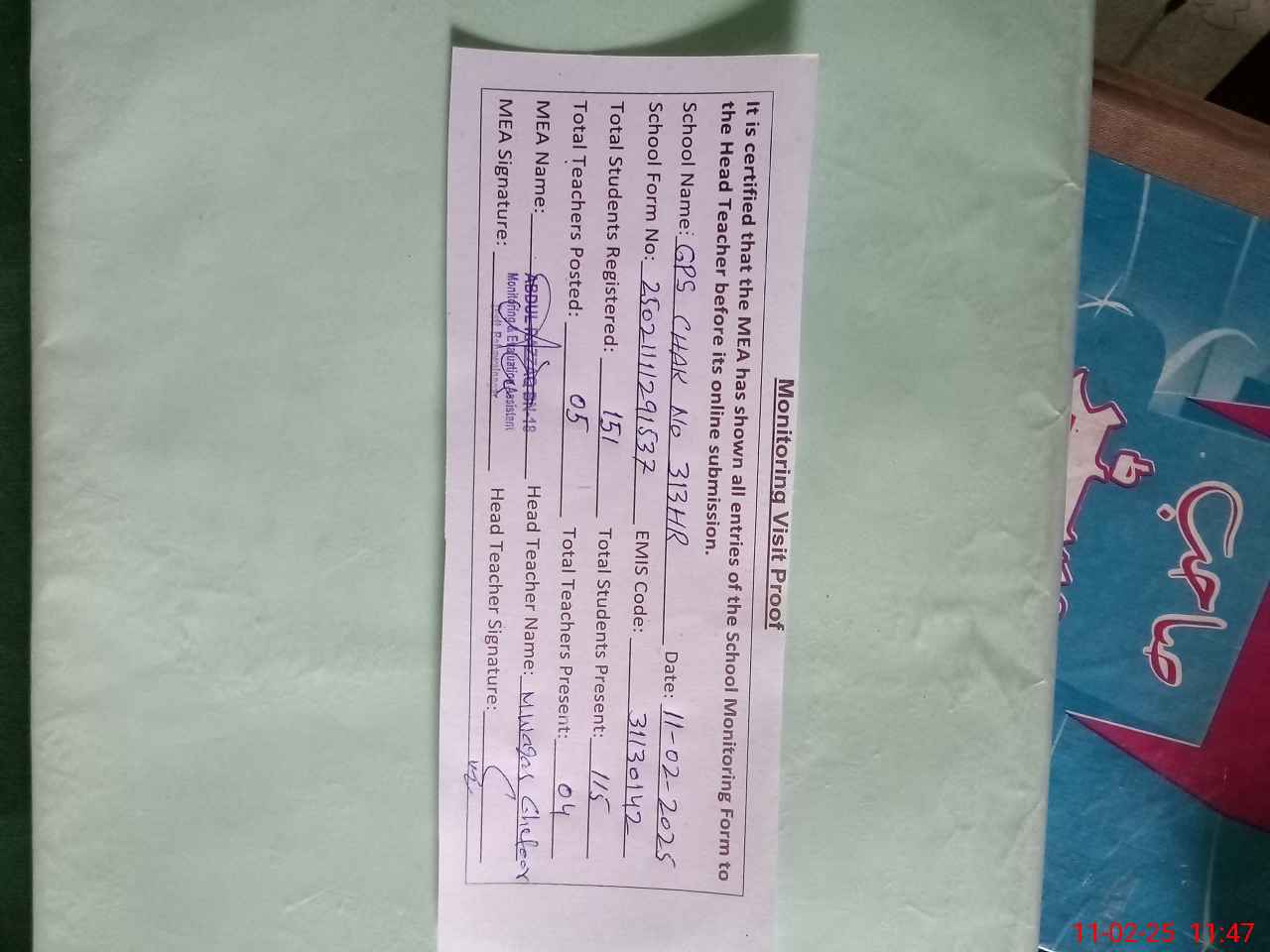 | Attendance Register | Head Teacher | MEA with School | Visit Proof |