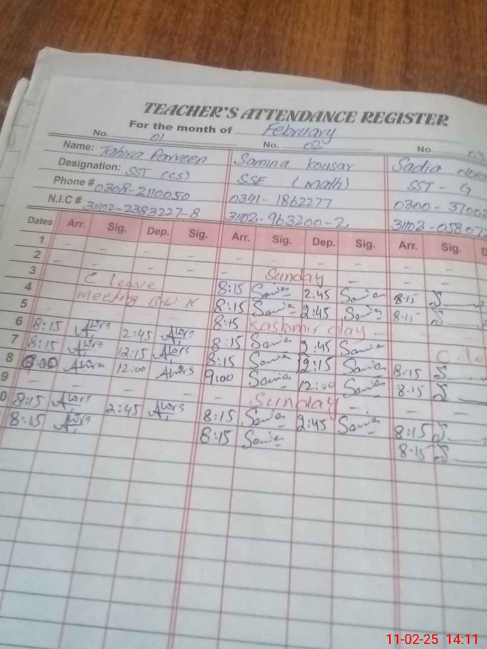 | CNIC | Full Name | Designation | R/C | Absence During Last Calender Month |