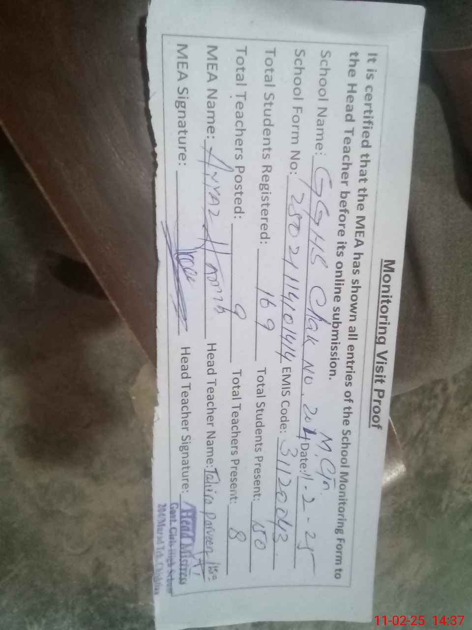 | Attendance Register | Head Teacher | MEA with School | Visit Proof |