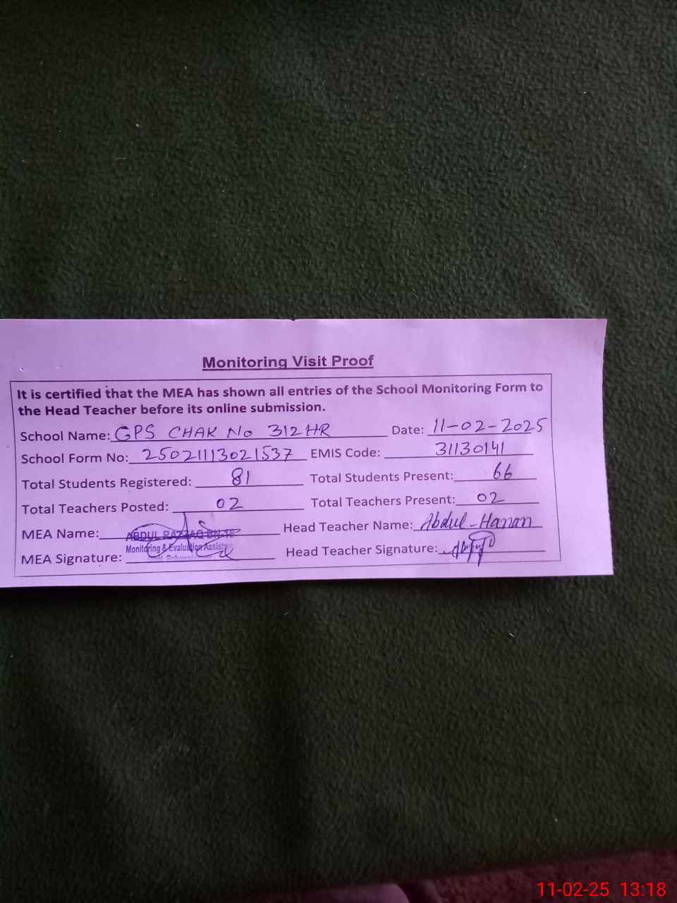 | Attendance Register | Head Teacher | MEA with School | Visit Proof |