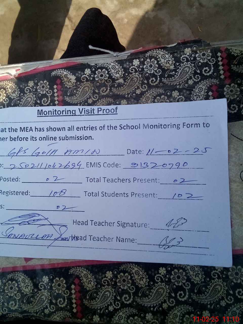 | Monitoring Date: 11-02-2025 | Start Time: 11-02-2025 10:42 AM | End Time: 11-02-2025 11:10 AM | Name of MEA: Mu**** Sa**** Ul**** Sa**** | |