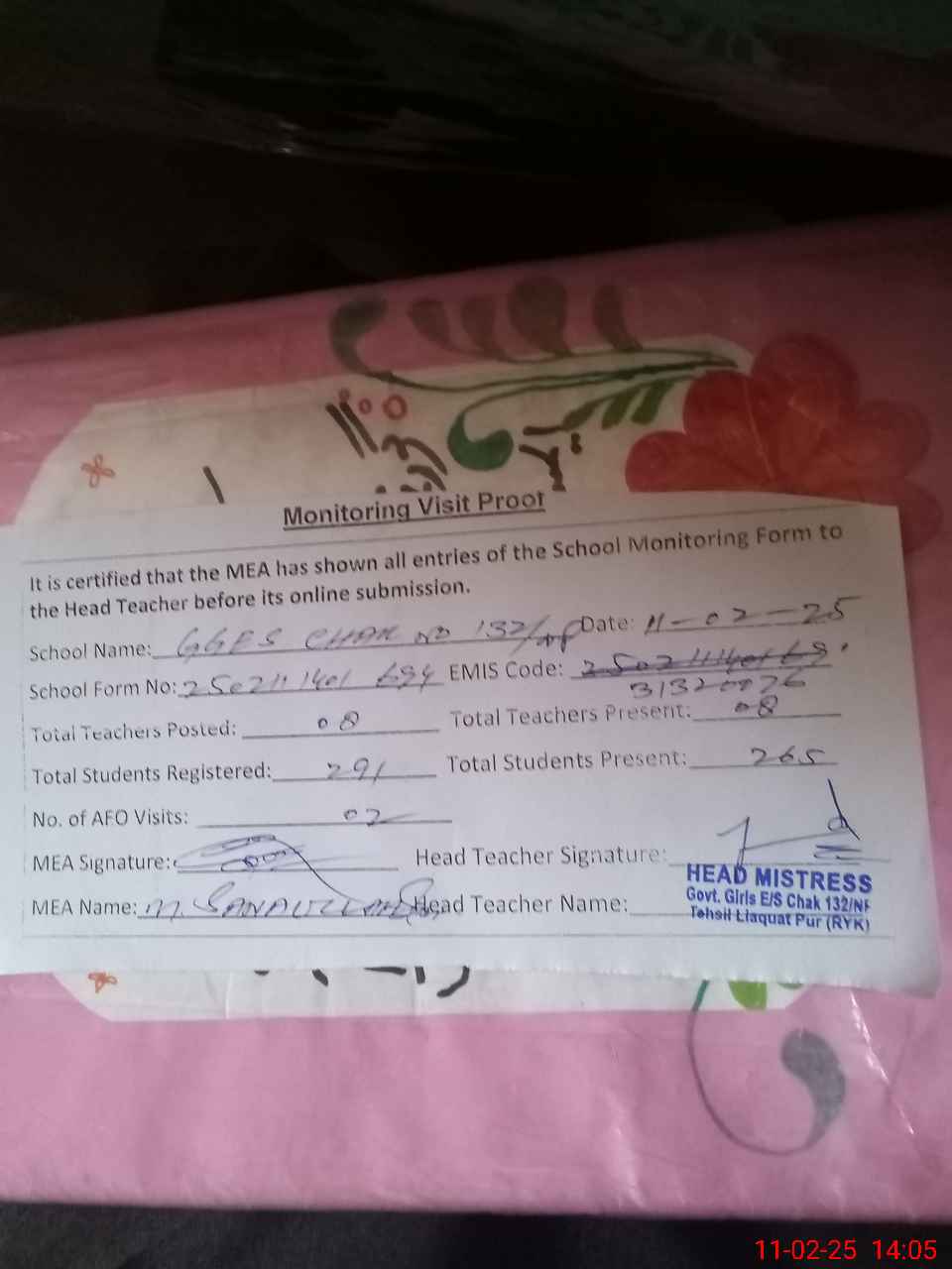 | Attendance Register | Head Teacher | MEA with School | Visit Proof |