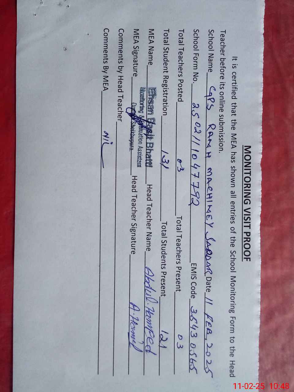 | Attendance Register | Head Teacher | MEA with School | Visit Proof |