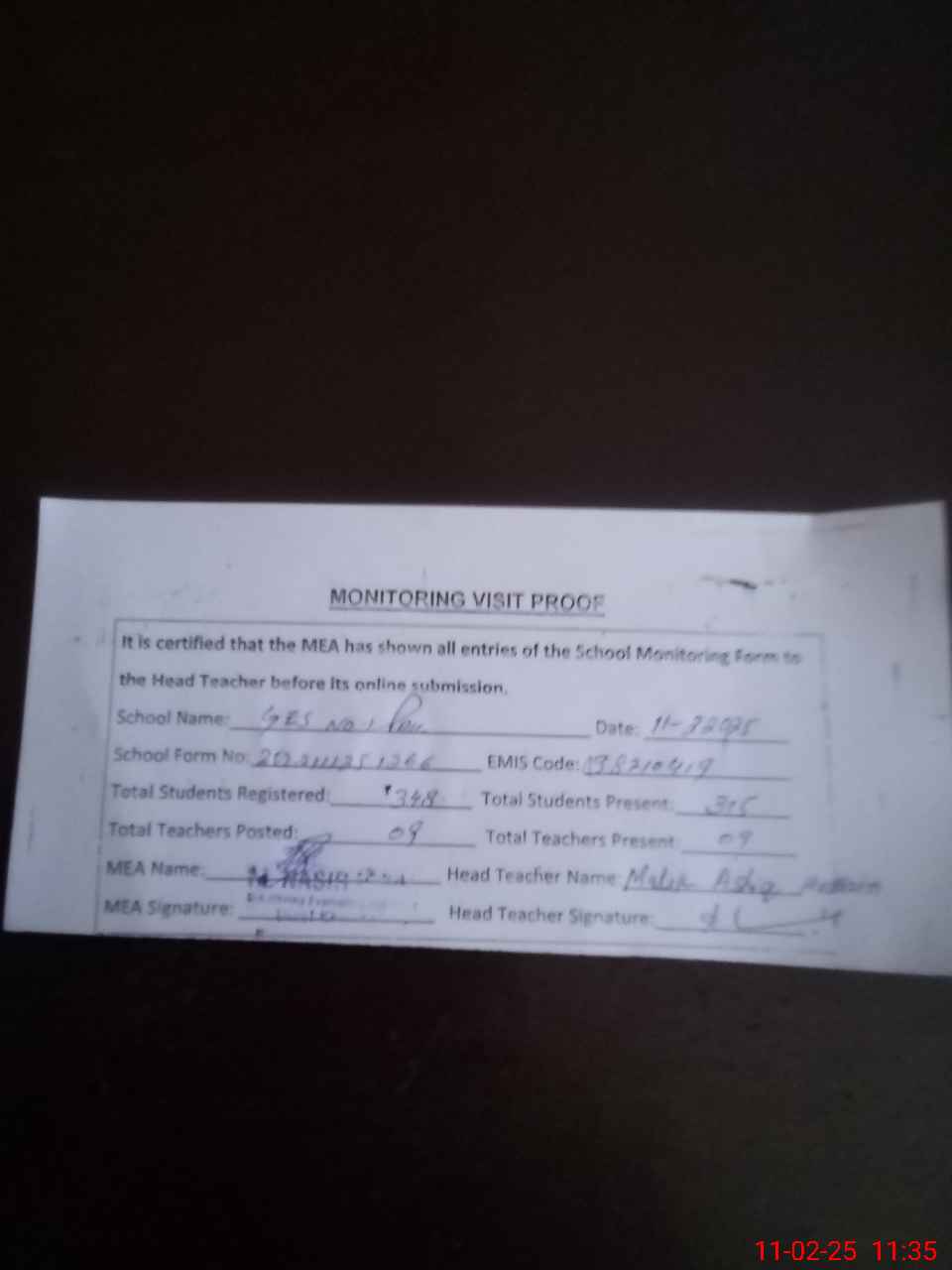 | Attendance Register | Head Teacher | MEA with School | Visit Proof |