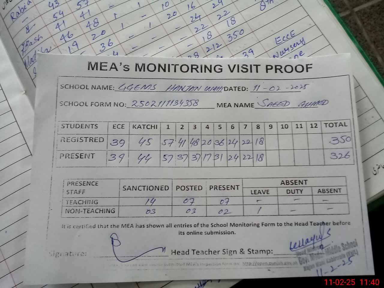 | Certified that this School was Inspected by the Undersigned MEA/DMO Today and the Information Stated Above is as Per Record. | |||||