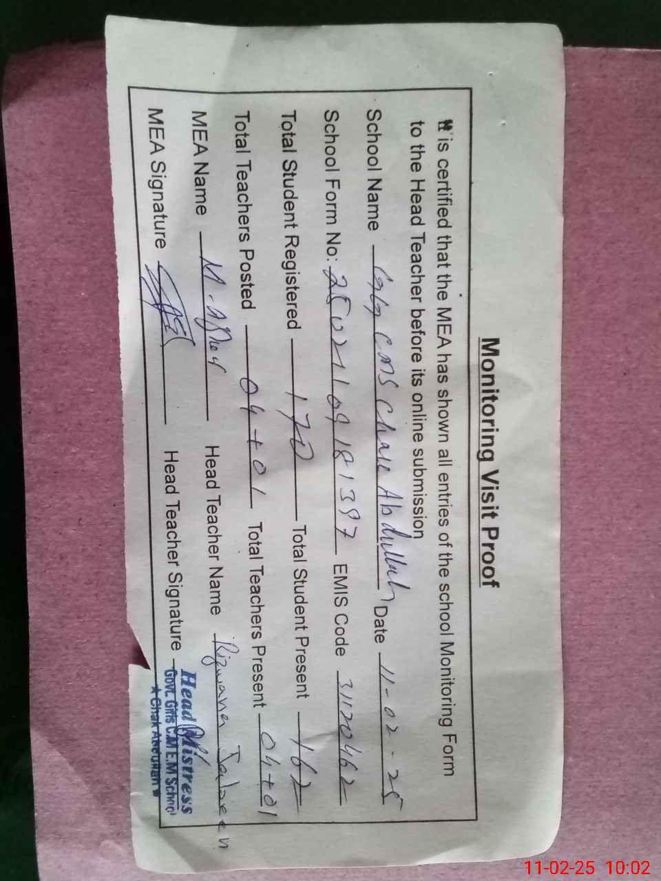 | EMIS Code: 31120462 | Name of School: GGCMS CHAK ABDULAH | |||