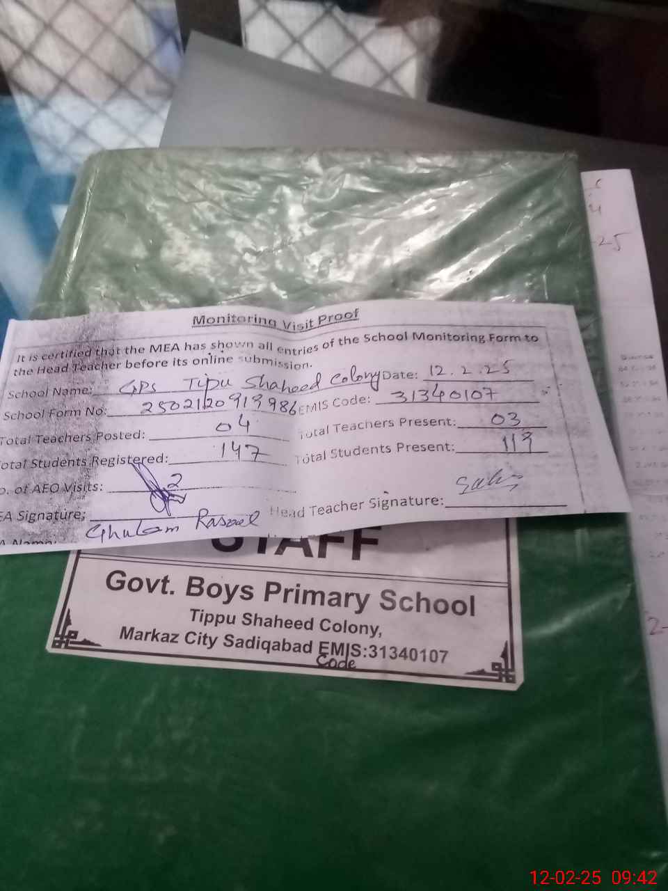 | Attendance Register | Head Teacher | MEA with School | Visit Proof |
