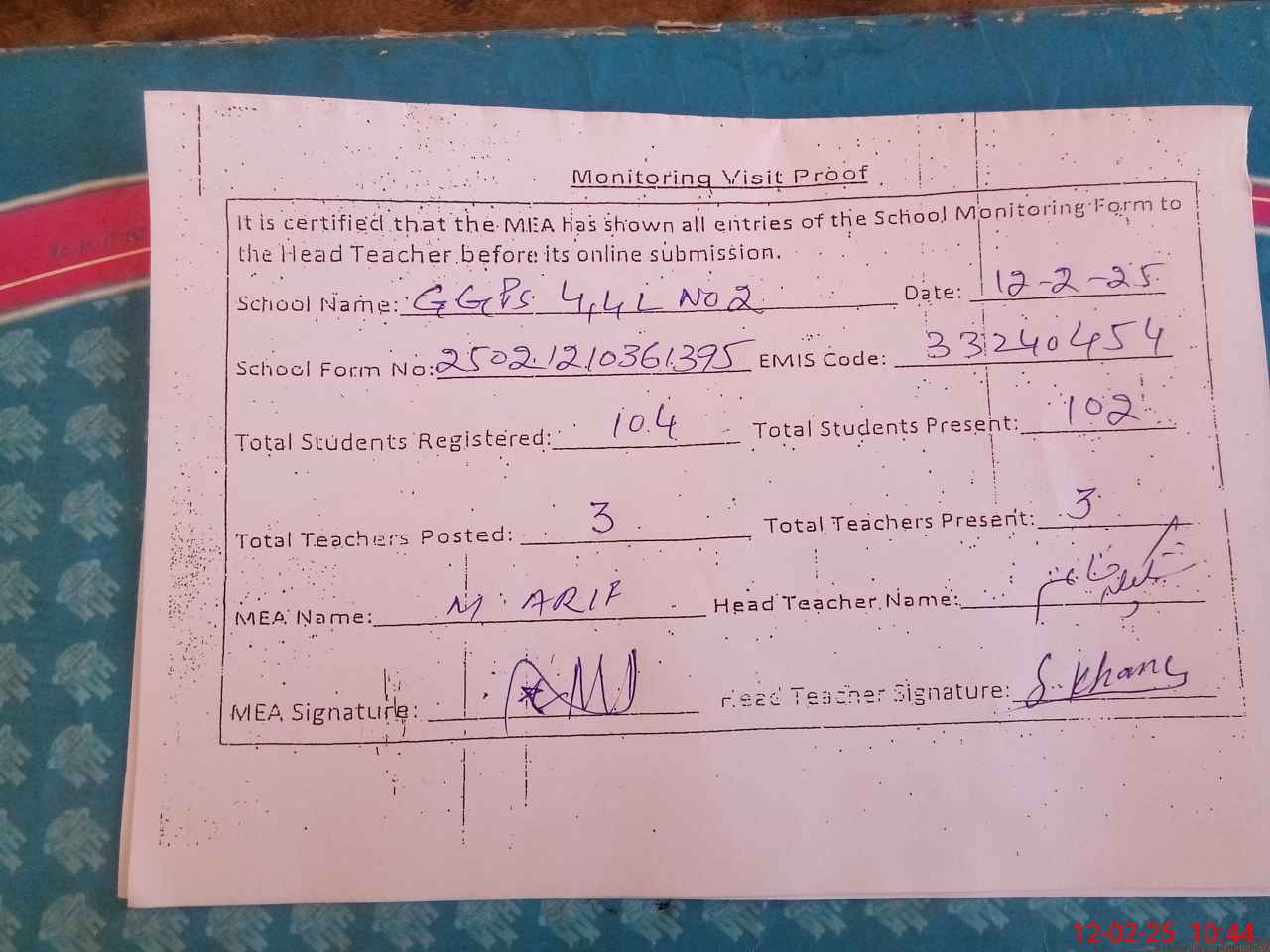 | Attendance Register | Head Teacher | MEA with School | Visit Proof |