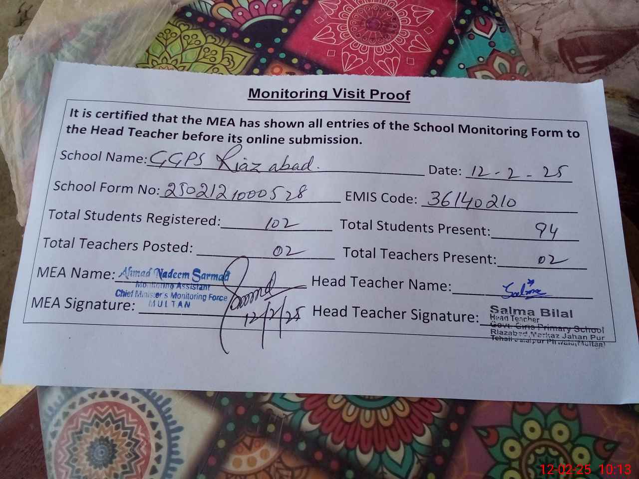 | Attendance Register | Head Teacher | MEA with School | Visit Proof |