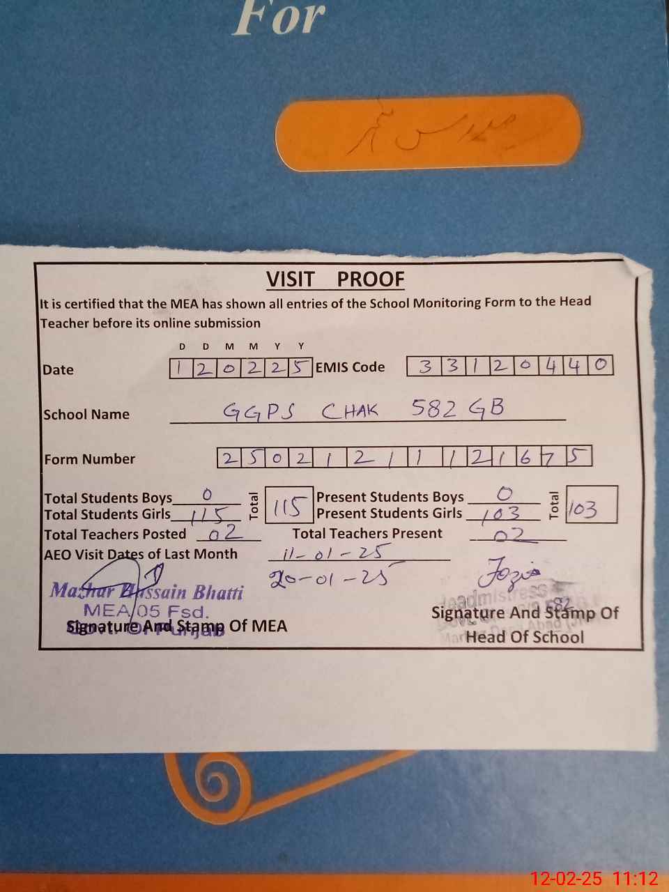| Attendance Register | Head Teacher | MEA with School | Visit Proof |