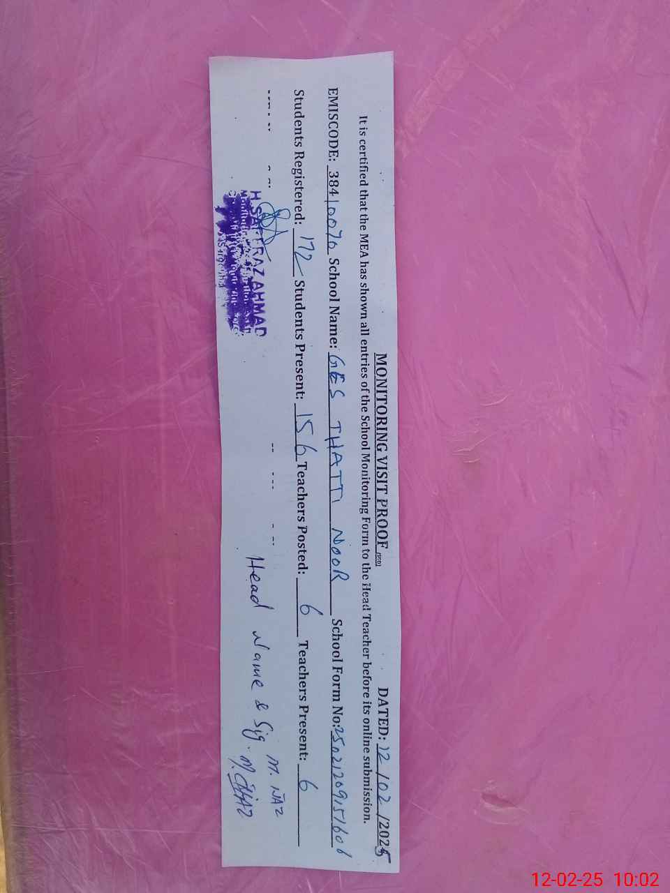 | Attendance Register | Head Teacher | MEA with School | Visit Proof |