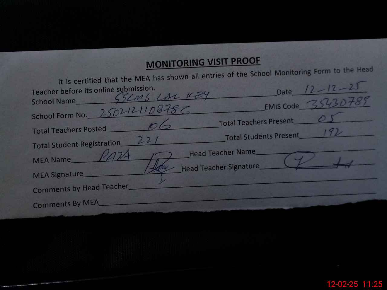 | Attendance Register | Head Teacher | MEA with School | Visit Proof |