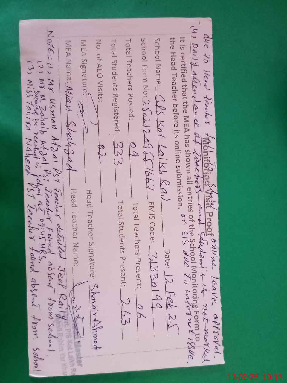 | Remarks (Use Separate Page if Required): 1 Daily attendance of teachers and students is not marked on SIS 2 Mr Usman Afzal PST teacher found absent from school during visit because he reached in school at 0945 Hrs 3 Mr Usman Afzal PST teacher detailed for Jeep daily 4 Miss Tahira Naheed PST teacher found absent from school during visit due to head teacher fail to show online leave approval | |||||