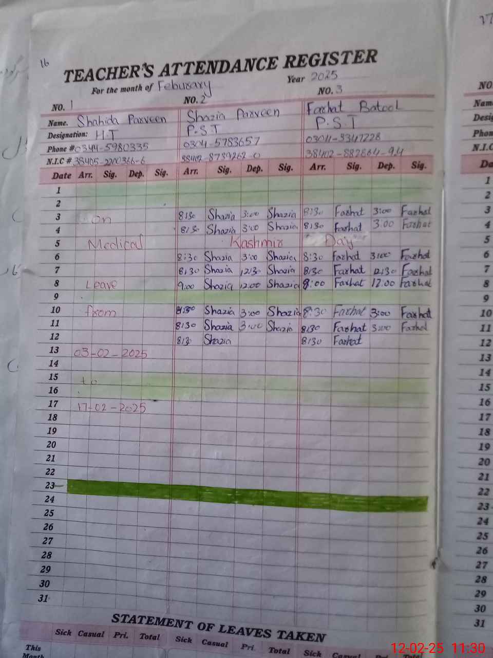| CNIC | Full Name | Designation | R/C | Absence During Last Calender Month |
