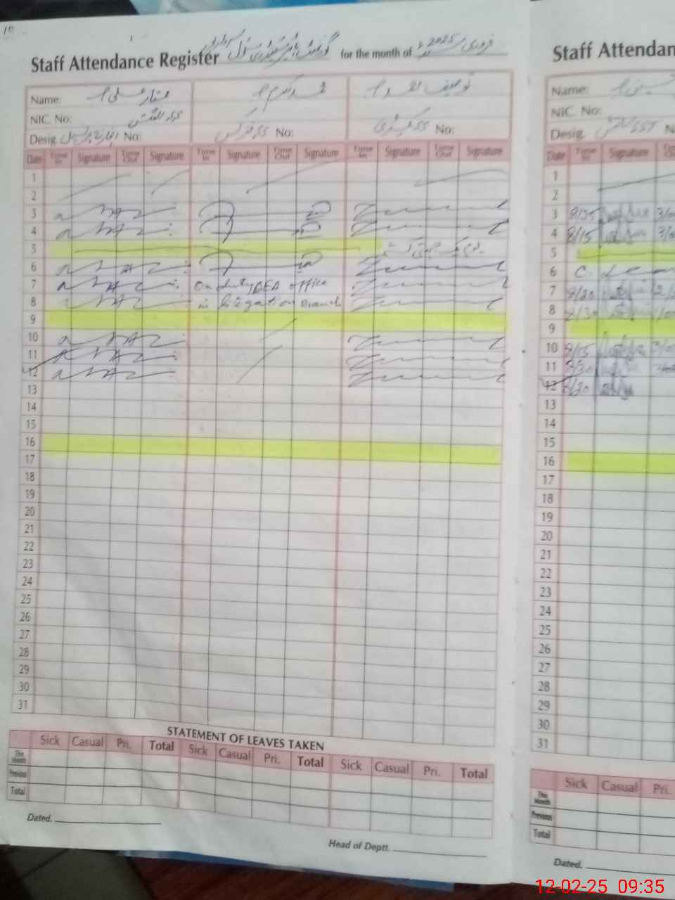 | CNIC | Full Name | Designation | R/C | Absence During Last Calender Month |