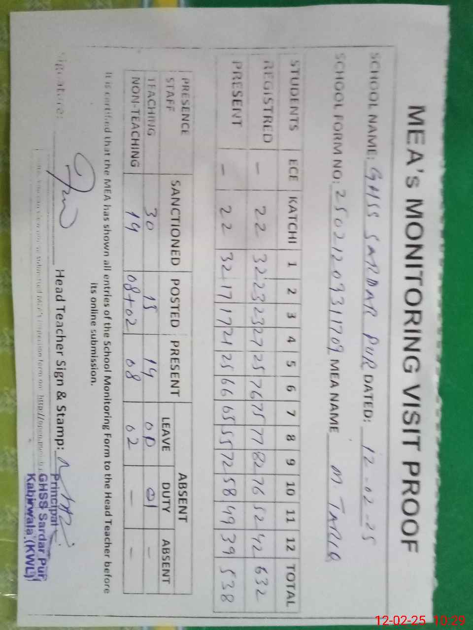 | Attendance Register | Head Teacher | MEA with School | Visit Proof |