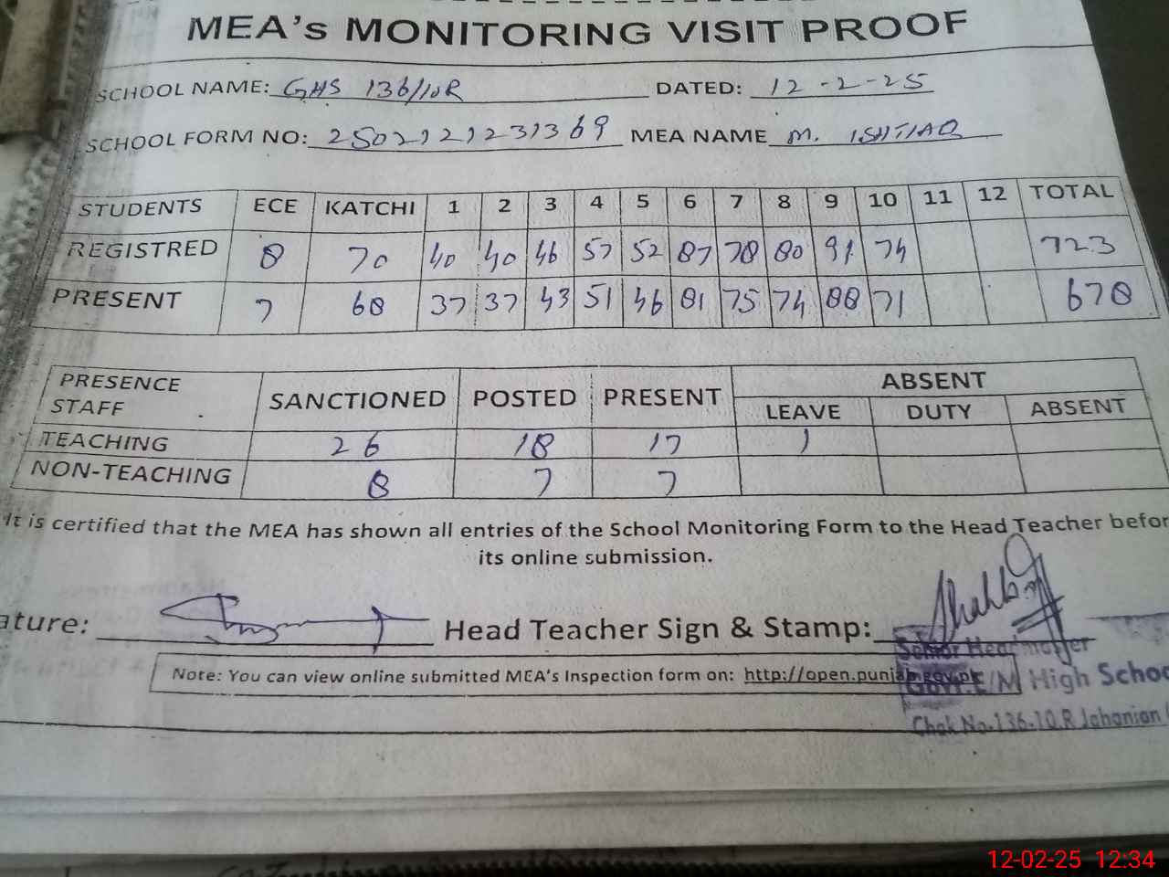 | Attendance Register | Head Teacher | MEA with School | Visit Proof |