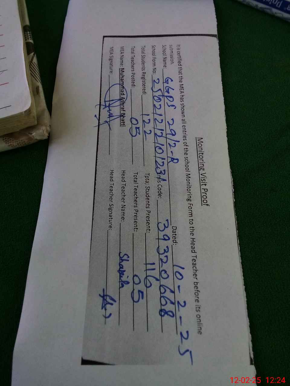| Attendance Register | Head Teacher | MEA with School | Visit Proof |