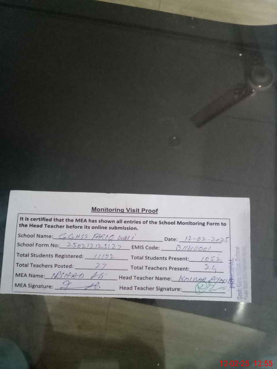 | Attendance Register | Head Teacher | MEA with School | Visit Proof |