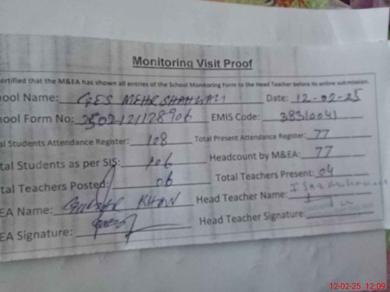 | Attendance Register | Head Teacher | MEA with School | Visit Proof |