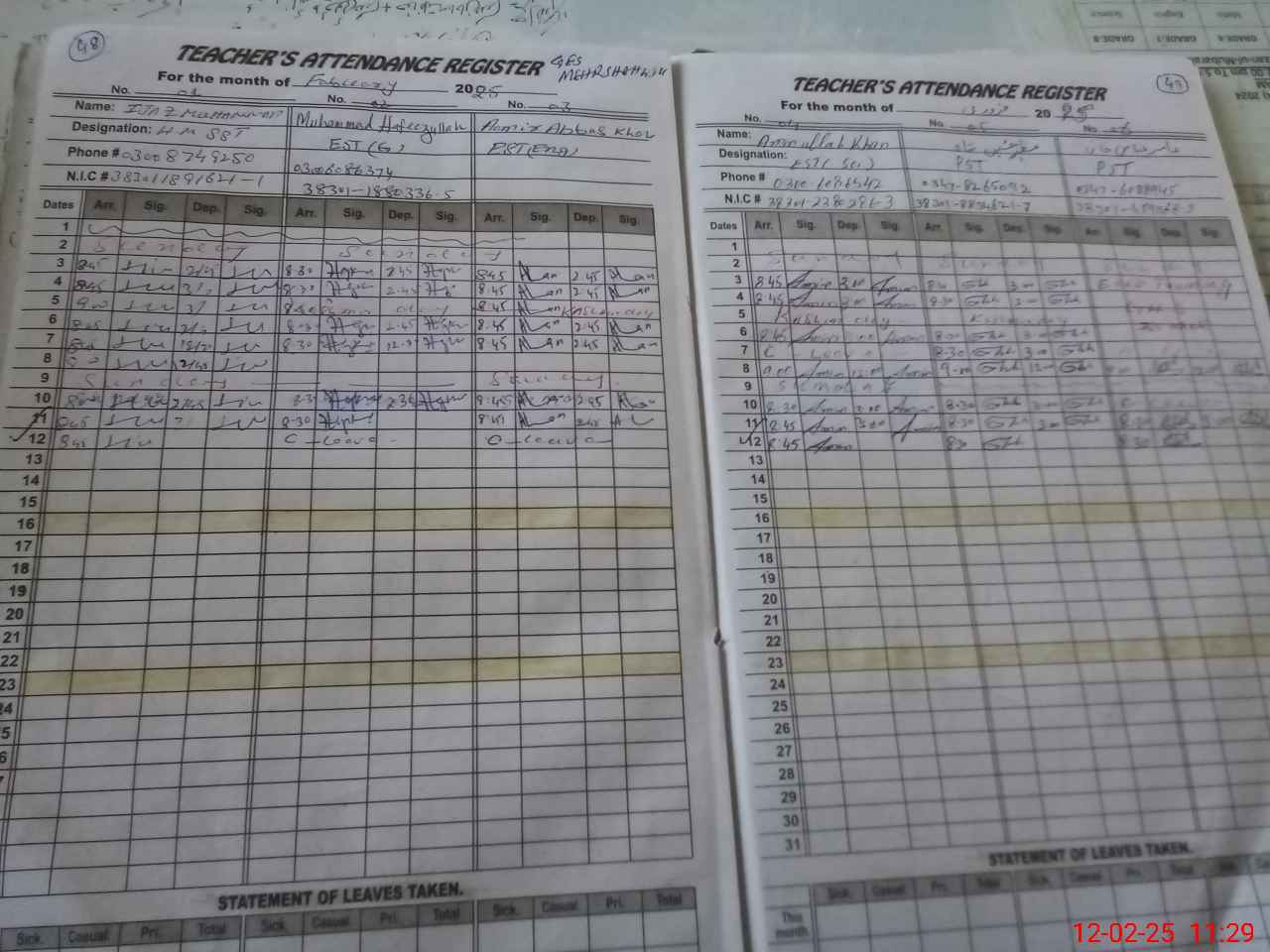 | CNIC | Full Name | Designation | R/C | Absence During Last Calender Month |