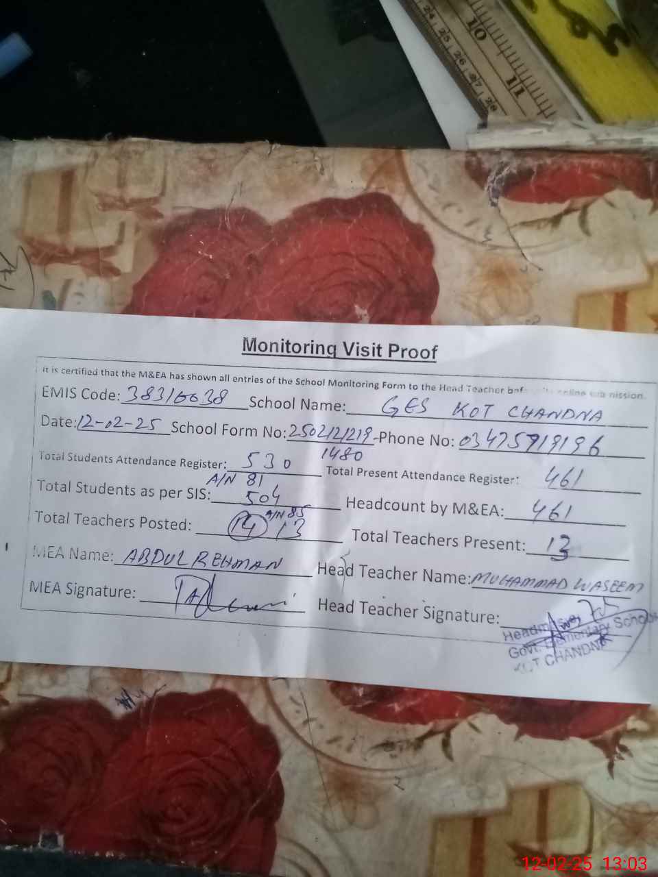 | Attendance Register | Head Teacher | MEA with School | Visit Proof |