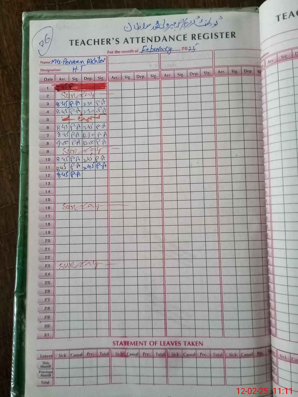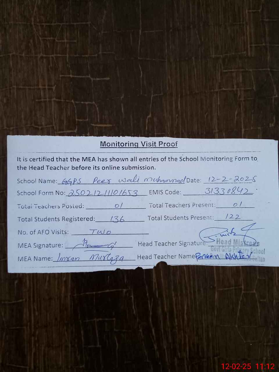 | Attendance Register | Head Teacher | MEA with School | Visit Proof |