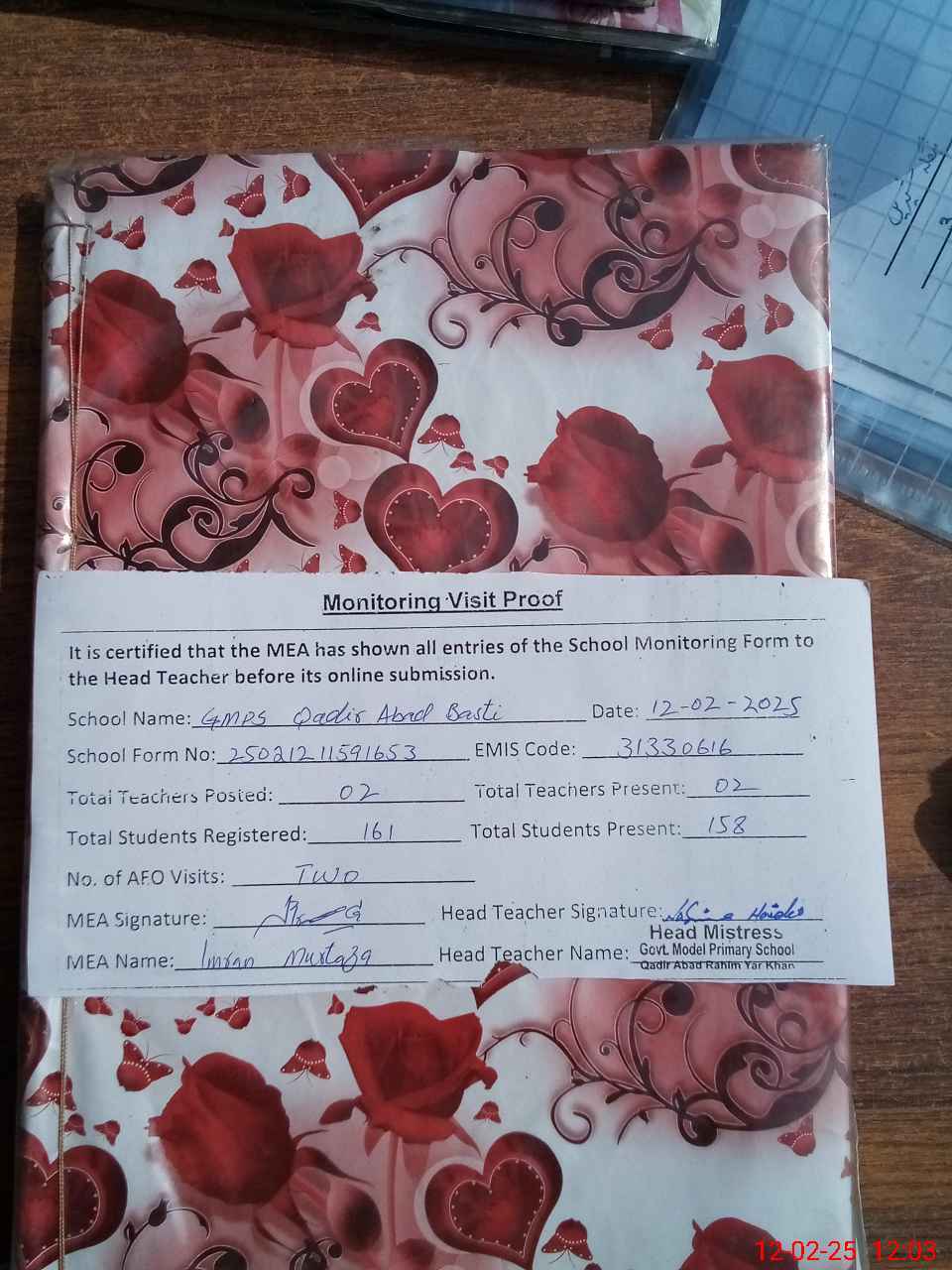 | Attendance Register | Head Teacher | MEA with School | Visit Proof |