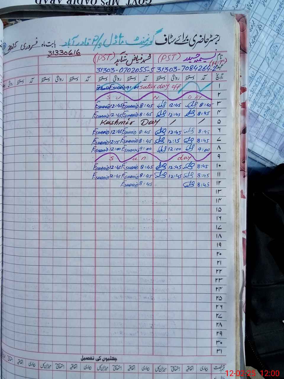 | CNIC | Full Name | Designation | R/C | Absence during last cal. month |